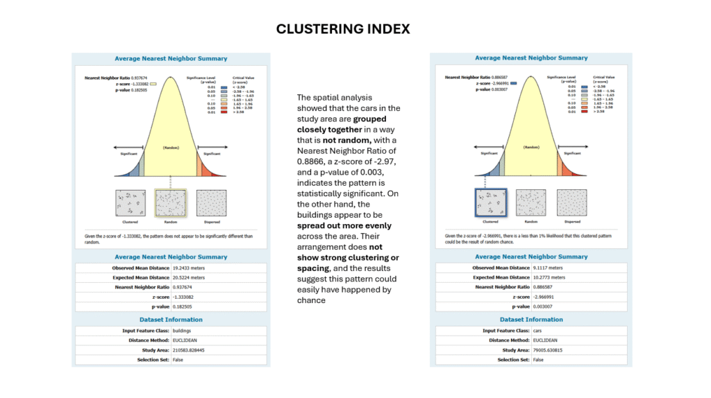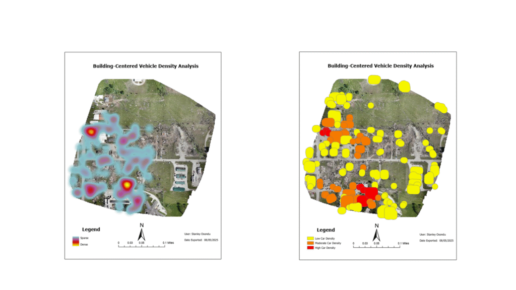 The study utilized RGB drone imagery from OpenAerialMap, processed using pretrained ArcGIS Pro deep learning models—for car detection and building extraction. The workflow involved preprocessing of drone imagery, applying object detection models, and generating geospatial vector outputs. These detections were then analyzed through proximity-based spatial analysis, particularly buffer analysis, which quantified the number of vehicles within a set distance from detected buildings. The results were visualized using graduated symbology and heatmaps in ArcGIS Pro, facilitating urban density interpretation and damage impact mapping.