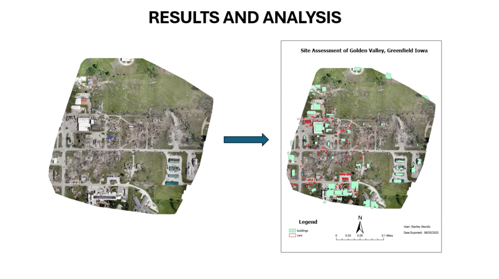 Greenfield, Iowa, located in Adair County, is a small Midwestern town that was recently impacted by a tornado in 2023. This event created a pressing need for spatially precise damage and infrastructure assessments. The town’s urban morphology, composed of residential blocks, civic centers, and open spaces, presents an ideal case for drone-based object detection. High-resolution drone imagery from OpenAerialMap was used in this study to delineate building footprints and identify vehicle distributions across the town’s-built environment.